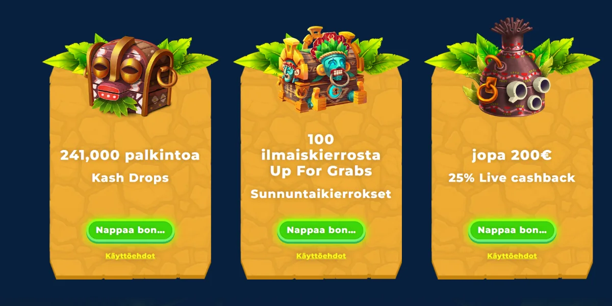 Päivittäiset tarjoukset näkyvät mobiilisivuston etusivulla. Cashback-bonukset ja reload-tarjoukset aktivoituvat samalla tavalla.